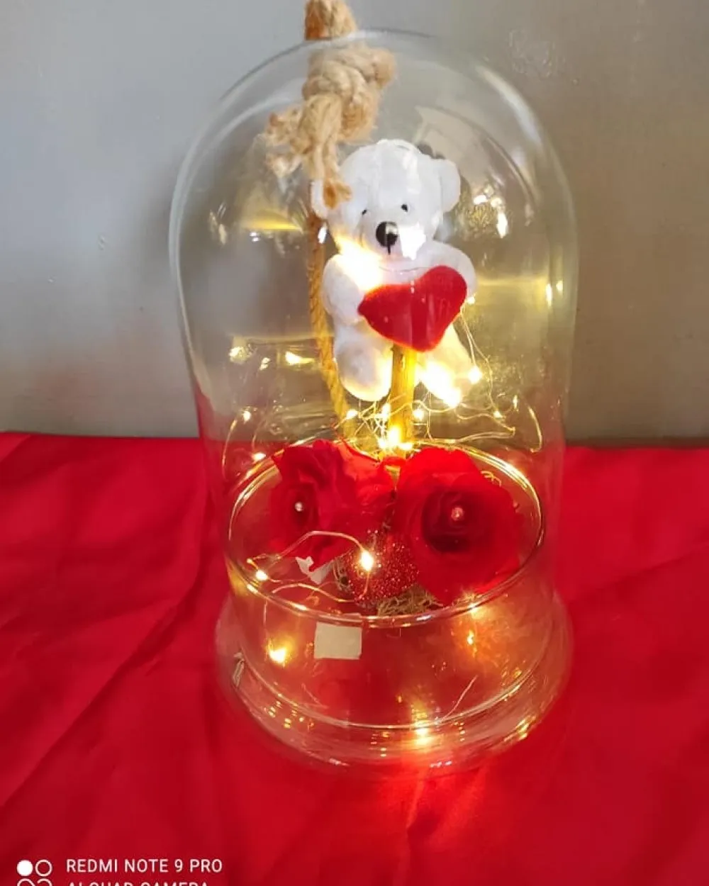 Καμπάνα μεγάλη με 2 αθάνατα τριαντάφυλλα κόκκινα και αρκουδάκι με λαμπάκια
