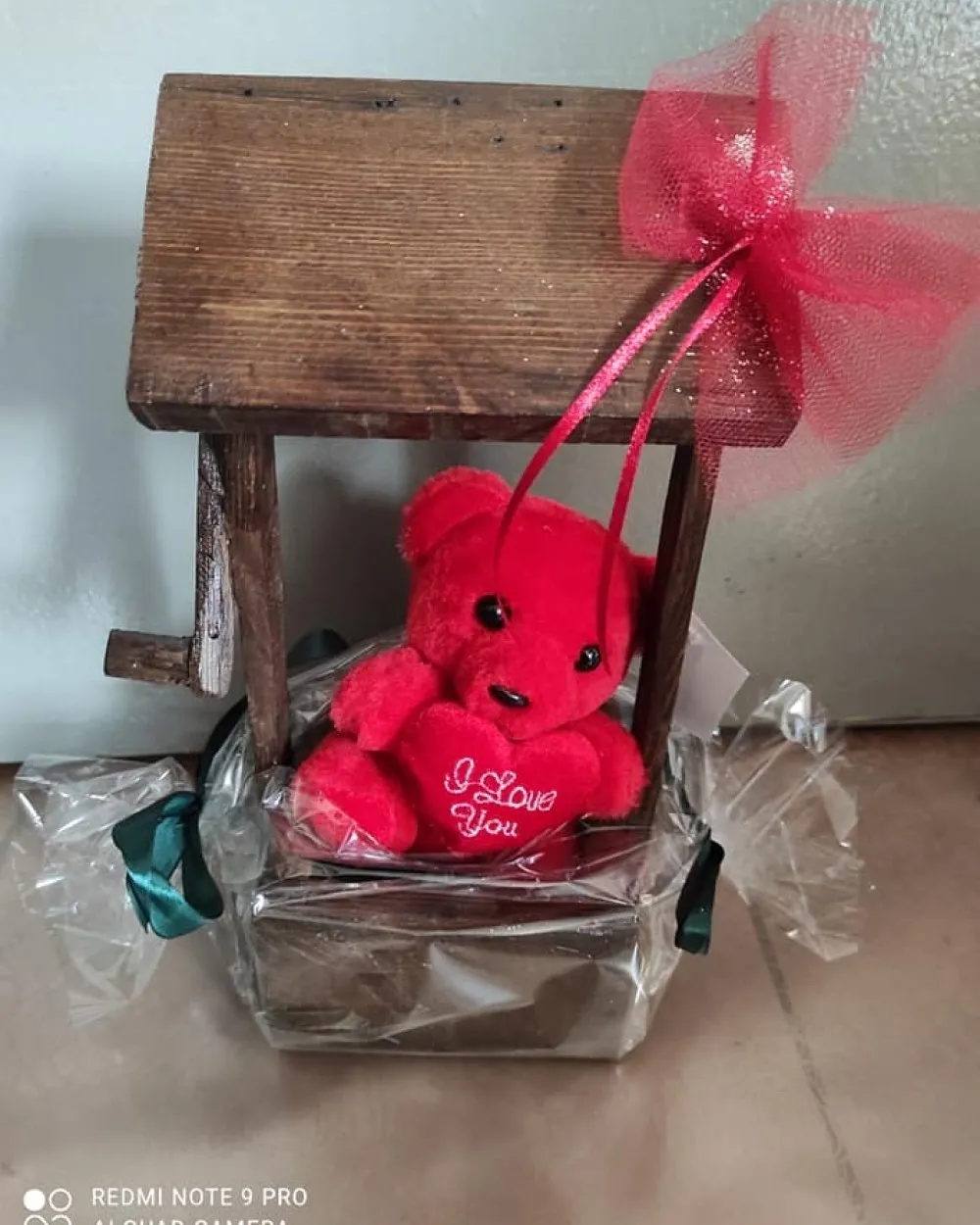Ξύλινο πηγάδι με αρκουδάκι κόκκινο