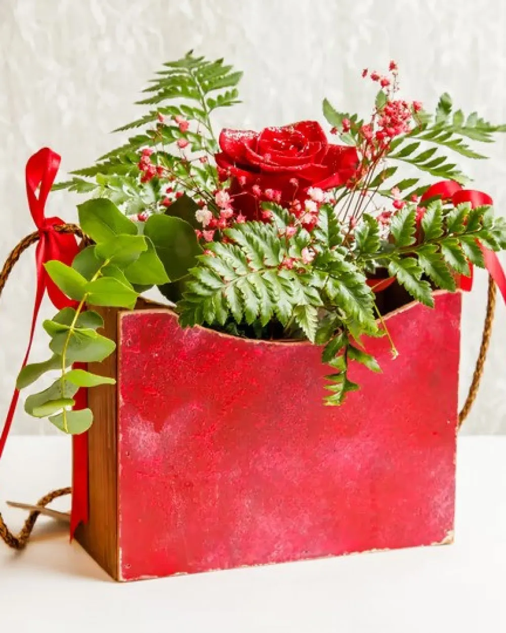 Ξύλινο τσαντάκι με κόκκινο τριαντάφυλλο & φυλλώματα